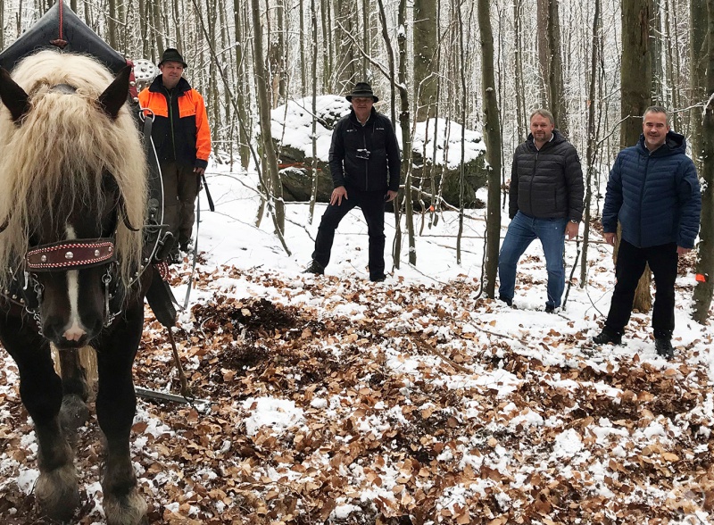 Wie Pferd Moritz Buchenstämme in die Versuchsflächen zieht, erklärte Nationalparkmitarbeiter Stephan Melch (v.l.) dem Nationalparkleiter Dr. Franz Leibl, Bürgermeister Michael Herzog (v.r.) und seinem Stellvertreter Manfred Schröder.