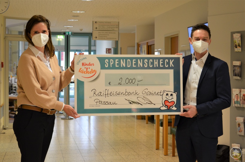 Christian Schnelzer hat selbst zwei Kinder und weiß um die Wichtigkeit, wenn einem, bei einer Krankheit oder einem Unfall, geholfen werden kann und man als Familie geschlossen wieder nach Hause kommt. Der Familienvater ist Vorstand der Raiffeisenbank Grainet und durfte bei einer Spendenübergabe in der Kinderklinik Dritter Orden Passau nun einen Scheck in Höhe von 2.000 Euro an die Stiftung Kinderlächeln übergeben.