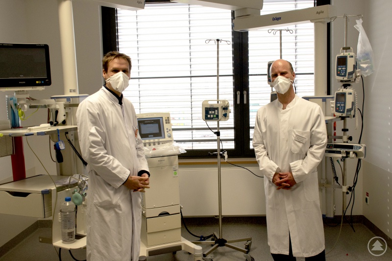 (von links): Chefarzt Prof. Dr. Schmidt-Wilcke begrüßt den neuen Leiter der Intensivstation Priv.-Doz. Dr. Joachim Scheßl in den neuen Räumlichkeiten