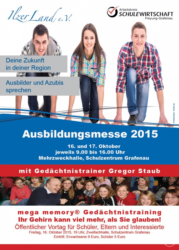 Grundlage für die Suche eines Ausbildungsplatzes ist natürlich ein ordentlicher Schulabschluss. Deshalb wurde der bekannte Gedächtnistrainer Gregor Staub eingeladen. Unter dem Motto „Ihr Gehirn kann viel mehr, als Sie glauben!“ zeigt er, dass Lernen keine reine Begabung ist, sondern mit der richtigen Technik viel einfacher geht. Für alle Interessierten findet am Freitag, den 16.10. um 19 Uhr ein öffentlicher Vortrag statt.