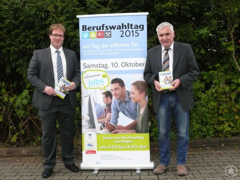 Regionalmanager Stephan Lang (l.) von der ARBERLAND REGio GmbH und Ernst Ziegler, Leiter der Berufsschule in Regen, stellten die druckfrischen Messekataloge für den Berufswahltag am 10. Oktober vor, die eben an die Schulen im Landkreis verteilt wurden. Bei der größten Ausbildungs- und Jobmesse im Landkreis erfahren Jugendliche, aber auch Erwachsene einiges über die Ausbildungs- und Berufschancen in der Region.