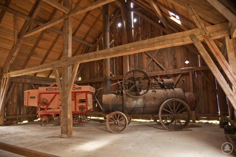 Eine Dreschgarnitur bestand aus dem Lokomobil (Dampfmaschine), der Dreschmaschine und manchmal einer Strohpresse. Zu besichtigen im Stadl vom Ambergerhofim Museumsdorf Bayerischer Wald.