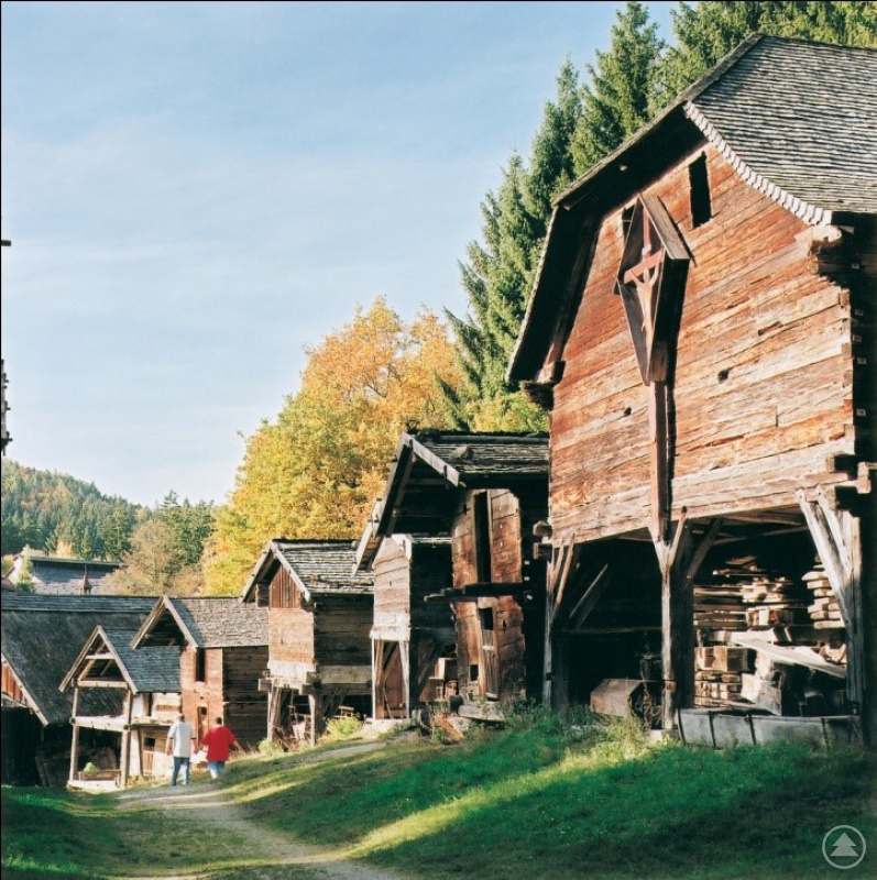 Im Museumsdorf sind 33 verschiedene Getreidekästen erhalten. 27 Getreidekästen stehen entlang einer Nebenstraße in einer Formenreihe.