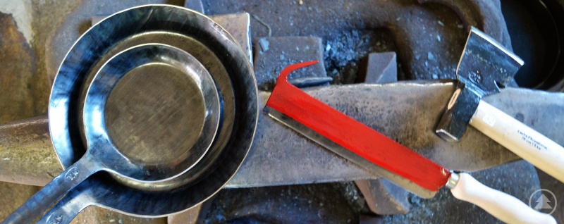 Eine geschmiedete Eisenpfanne. Von den Pfannen mit einem Durchmesser von 28 Zentimetern mache ich etwa 40 pro Woche. Pfannen sind aktuell der absolute Renner. Und jede ist ein Unikat. Oder jetzt vor dem herannahenden Winter auch gerne einen Eisstock.