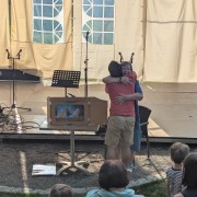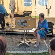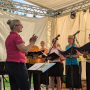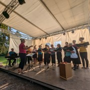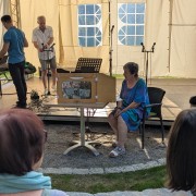 Gabriele Grünzweig lud bis kurz vor 18:00 Uhr zu ihrer Kinderlesung ein. Dafür hatte sie nicht nur spannende Geschichten vorbereitet. Auch Bilder, die ihre Erzählung liebevoll umrahmten, brachte die gute Seele mit. Frau Grünzweig ist nämlich keine Unbekannte: Schon seit mehr als 30 Jahren ist sie voller Herzblut ehrenamtlich tätig. Benachteiligte Schülerinnen und Schüler fördert die sympathische Dame zum Beispiel als Lesepatin. Wenig verwunderlich also, dass ihre Kinderlesung im Theatron für große Begeisterung bei den kleinen Gästen sorgte. Vorbei mit der guten Stimmung war es an diesem sonnigen Freitag aber auch danach noch lange nicht. Der Chor der Music Academy Deggendorf übernahm nun nämlich das Mikrofon: