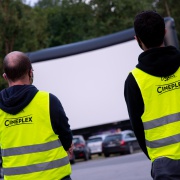 Relativ früh kamen die ersten Autos auf dem Parkplatz an, auf dem sonst eigentlich immer das Grafenauer Volksfest statt findet. Am Eingangsbereich werden zunächst die Tickets per Scan gecheckt. Direkt im Anschluss weist ein Cineplex-Mitarbeiter die Autos auf dem Parkplatz ein.