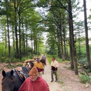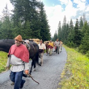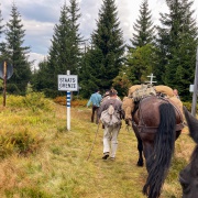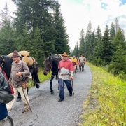 Die beschwerliche Route entlang des historischen Handelsweges Goldener Steig führte über die Blauen Säulen und den Pürstling nach Filipova Hut´, wo die erste Pause eingelegt wurde, bevor zur Mittagspause Horská Kvilda erreicht wurde. Großes Durchhaltevermögen musste der Grafenauer Zug beweisen, bis nach einer schier endlos scheinenden Wegstrecke endlich das Amaliental vor den müden Säumeraugen auftauchte. An der Kirche in Bergreichenstein, wo pünktlich zum Eintreffen der Salzsäumer auch eine Abordnung aus der Heimat wartete, wurden die Säumer gebührend empfangen.