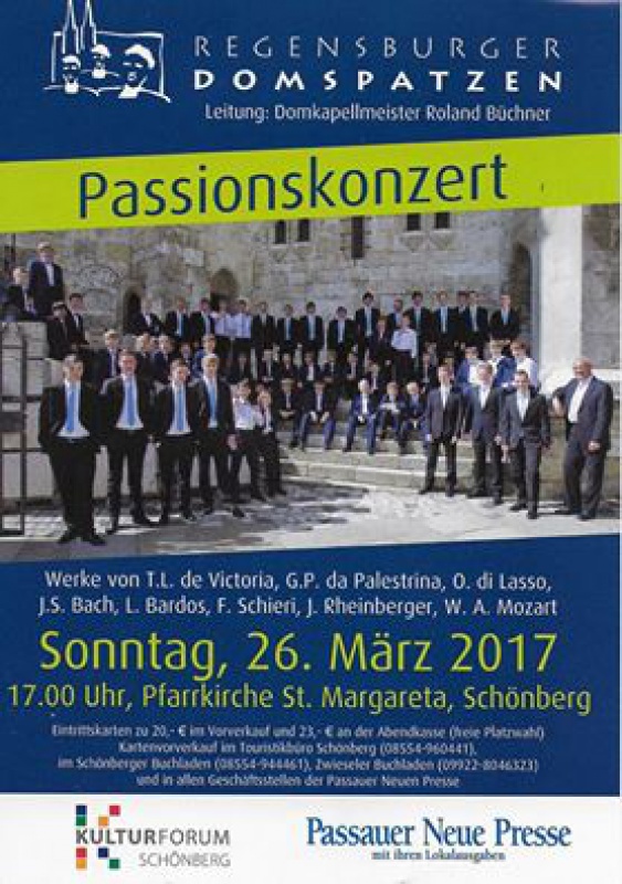 Auf dem Programm des Passionskonzertes unter der Leitung von Domkapellmeister Roland Büchner stehen Werke von T. L. de Victoria, G. P. da Palestrina, O. die Lasso. J. S. Bach, L. Bardos, F. Schieri, J. Rheinberger und W. A. Mozart.