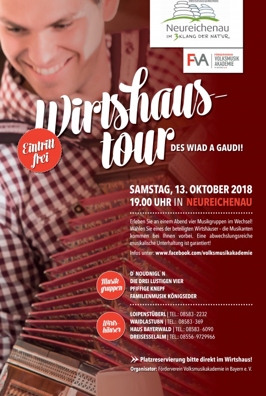 Seit drei Jahren organisiert der „Förderverein Volksmusikakademie in Bayern e.V.“ mittlerweile erfolgreich „musikalische Wirtshaustouren“. Diesmal marschieren die Musikanten durch Altreichenau und lassen sich dann in der Waidlerstubn, dem Loipenstüberl, im Haus Bayerwald und in der Dreisesselalm zum Musizieren nieder.