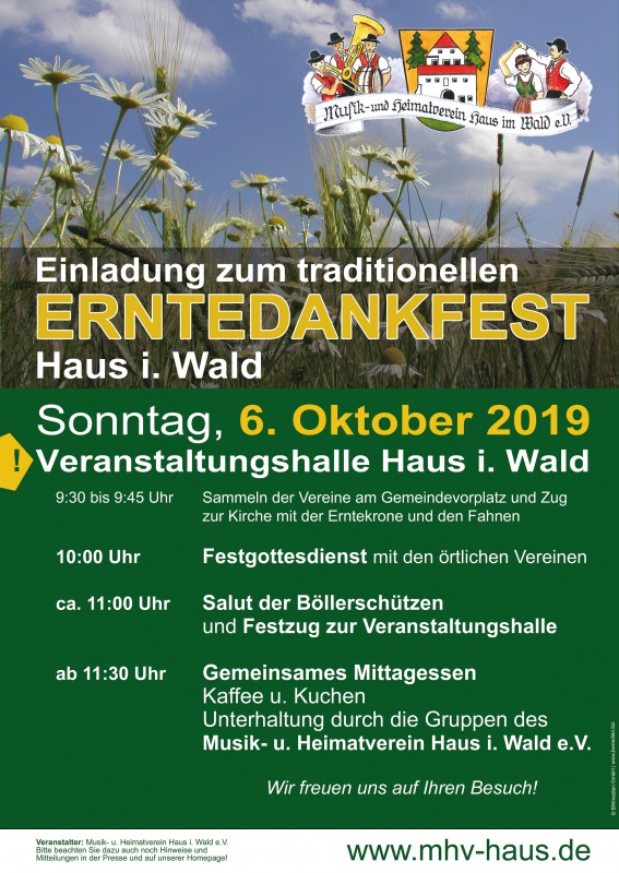 Am Sonntag, den 6. Oktober, richtet der Musik- und Heimatverein Haus i. Wald wieder das traditionelle Erntedankfest in der Veranstaltungshalle aus.