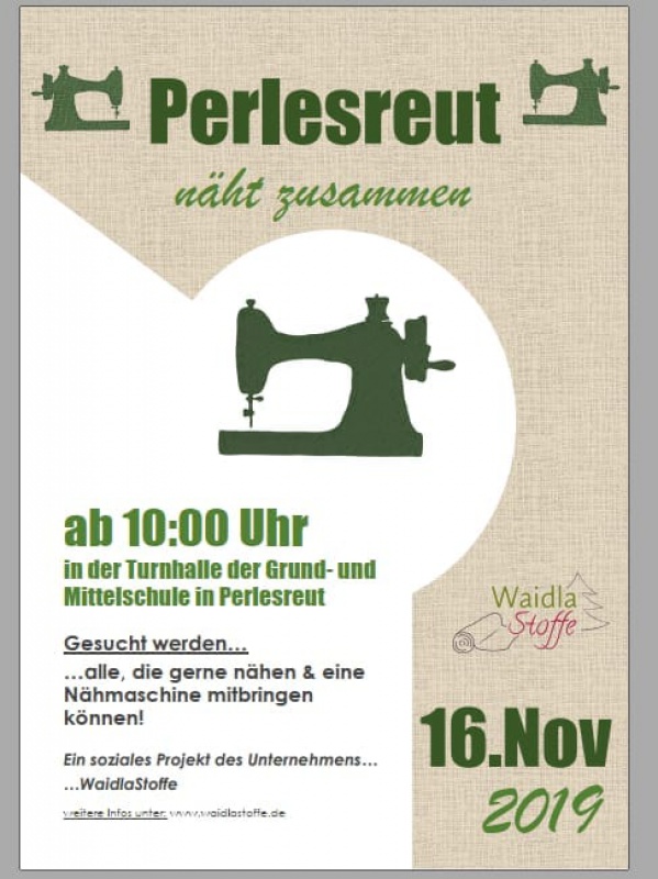 Die Veranstaltung „Perlesreut näht zusammen“ findet am Samstag, den 16. November 2019, ab 10 Uhr in der Turnhalle der Grund- und Mittelschule in Perlesreut statt. Diese wird von der Gemeinde Perlesreut unter der Leitung von unserem Bürgermeister Herrn Poschinger und dem Schulleiter Herrn Friedl dankenswerterweise kostenlos zur Verfügung gestellt.