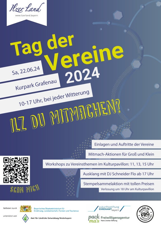 Zusammen mit der Stadt Grafenau und dem Regionalmanagement des Landkreises Freyung-Grafenau organisieren wir das Event. Der Tag der Vereine findet am Samstag, den 22. Juni 2024 bei jeder Witterung von 10 bis ca. 17 Uhr im Grafenauer Kurpark statt und geht anschließend in einen gemütlichen Ausklang mit Musik über. Geplant sind tolle Mitmachaktionen der vielfältigen Vereine im Ilzer Land und darüber hinaus.