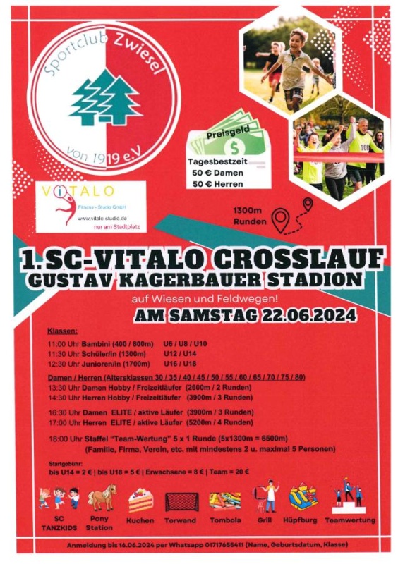 -Gustav-Kagerbauer-Stadion, Lohmannmühlweg 65, auf Wiesen und Feldwegen! Verschiedene Klassen; Alter von U6 bis 80; Hobby/Freizeitläufer bis "Elite"/aktive Läufer; Team-Wertung als Familie, Firma, Verein etc.; Startgebühr: bis U14: 2,--€; bis U18: 5,--€; Erwachsene 8,--€; Team: 20,--€; Anmeldung bis 16.06.2024 per Whats-App unter 0171-7655411 (Name, Geburtsdatum, Klasse)