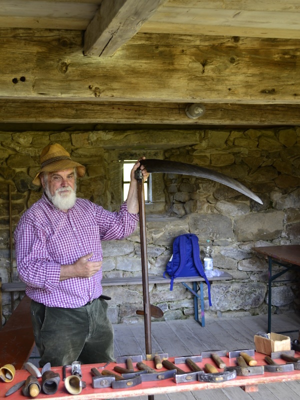 - Traditionelle Sensenarbeit: Richard Bals zeigt im Raidlhaus, wie man mit der Sense mäht und gibt Tipps zur Erleichterung dieser Arbeit.