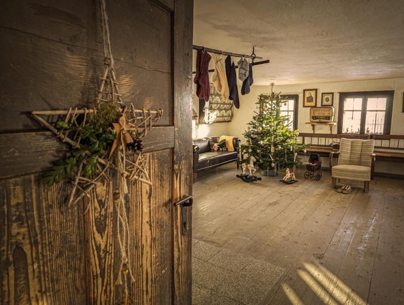 Bei Glühwein und Plätzchen sitzen hier Einheimische und Urlauber gemütlich bei einem Ratsch zusammen. - Mittendrin in der Stube arbeitet eine Handarbeiterin konzentriert und geduldig an Socken, Pullover oder Mützen. Eine Auswahl ihrer selbstgestrickten Handarbeiten bietet sie zum Verkauf an.
