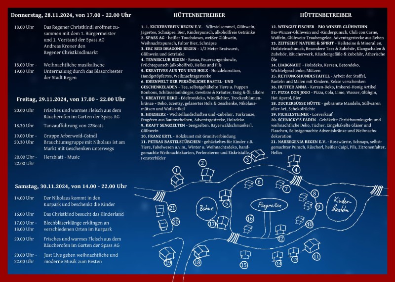- 18:00 Uhr Das Regener Christkindl eröffnet zusammen mit dem 1. Burgermeister und 1. Vorstand der Spass AG Andreas Kroner den Regener Christkindlmarkt