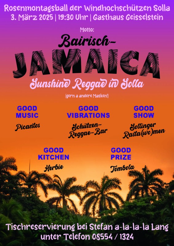 Am 03. März 2025 steigt der legendäre Rosenmontagsball der Windhochschützen Solla – und dieses Jahr wird’s besonders exotisch! Unter dem Motto "Bairisch - Jamaica!" erwarten euch bayerische Traditionen, kombiniert mit der lockeren Lebensfreude der Karibik. Ein Abend voller Musik, guter Laune und unvergesslicher Momente steht bevor!