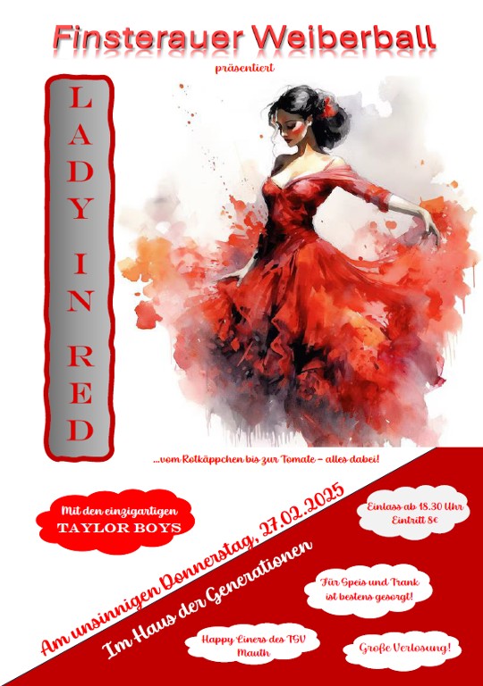 Motto "Lady in Red" - vom Rotkäppchen bis zur Tomate ist alles dabei! Mit den einzigartigen "Taylor Boys", den Happy Liners des TSV Mauth und großer Verlosung