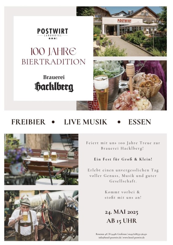 Feiere mit uns 100 Jahre Brautradition der Brauerei Hacklberg im Landhotel Postwirt in Grafenau! Ein Fest für Groß und Klein erwartet dich!