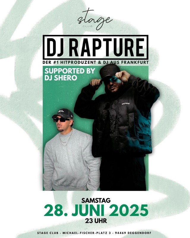 Am Samstag, 28. Juni 2025 bringt DJ Rapture, der #1 Hitproduzent und DJ aus Frankfurt, den Stage Club in Deggendorf zum Beben! Mit Support von DJ Shero erwartet euch eine energiegeladene Nacht mit exklusiven Beats und Abrissgarantie.