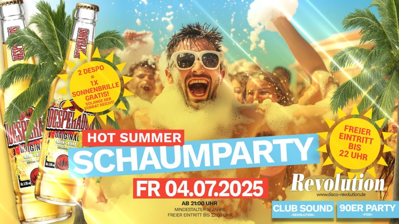 Feiere den Sommerbeginn mit der HOT SUMMER SCHAUMPARTY am Freitag, 4. Juli 2025, in der Discothek Revolution!