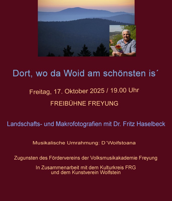 Eine wunderbare Kulturbegegnung mit Naturfotografien aus dem Unteren Bayerischen Wald bietet die Freybühne Freyung für Naturliebhaber und Heimatfreunde, renomierte Fotograf und Buchautor Dr. Fritz Haselbeck, Grainet, gibt unter dem Motto „Dort, wo da Woid am schönsten is´“ faszinierende Eindrücke und Stimmungsmotive in Bildform wieder. In einer Fotoschau erlebt man einmalige Makroansichten kleiner Tier- und Pflanzenwelten aus Naturnischen unserer Heimat. Dazu bilden Landschaftskulissen ein passendes und anziehendes Ambiente für besondere Weitblicke in die heimische Waldumgebung. Ausgewählte lyrische Kurztexte begleiten die Fotodarbietung