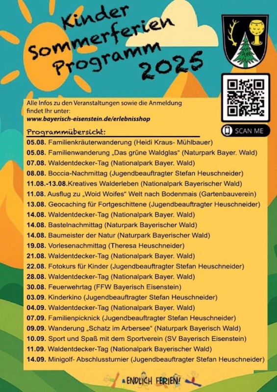 Anmeldung: spätestens 3 Tage vorher. Tel. 09925-9019001 oder https://shop.ferienregion-nationalpark.de/Erlebnisse/#/erlebnisse/BAY/fc05945c-77de-4ea6-8e24-f23455765c89/eisensteiner-sommerferienprogramm