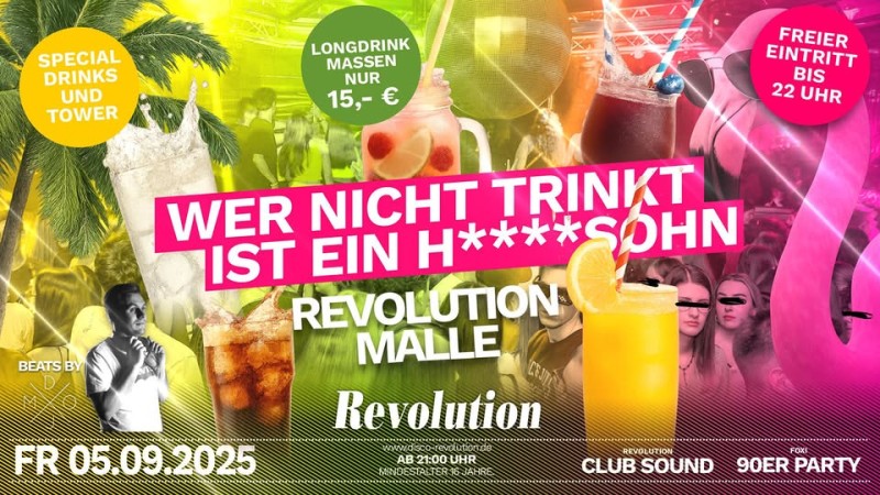 Am Freitag, 5. September 2025 verwandelt sich die Discothek Revolution in Deggendorf in die Partyhochburg der Region. Freut euch auf eine feucht-fröhliche Nacht voller Malle-Stimmung und Eskalation.