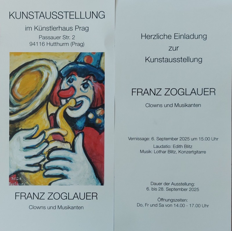 Herzliche Einladung zur Kunstausstellung von Franz Zoglauer mit dem Titel Clowns und Musikanten im Künstlerhaus Prag in Hutthurm.