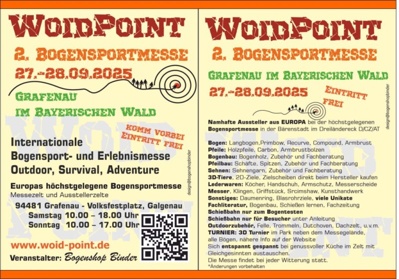 WoidPoint 2. Bogensportmesse – die internationale Bogensport- und Erlebnismesse findet am 27. und 28. September 2025 in Grafenau im Bayerischen Wald statt. Europas höchstgelegene Bogensportmesse bietet ein spannendes Programm rund um Bogen, Pfeile, Zubehör, Outdoor, Survival und Adventure.