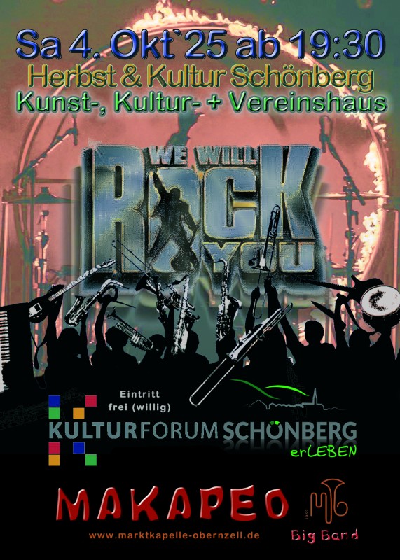 Am Vorabend des Schönberger Herbstmarktes heißt es im Kunst-, Kultur- und Vereinshaus (KuK) Schönberg We will rock you mit der Big Band Makapeo aus Obernzell. Dazu lädt das Kulturforum Schönberg am 4. Oktober 2025 ab 19:30 Uhr ein.
