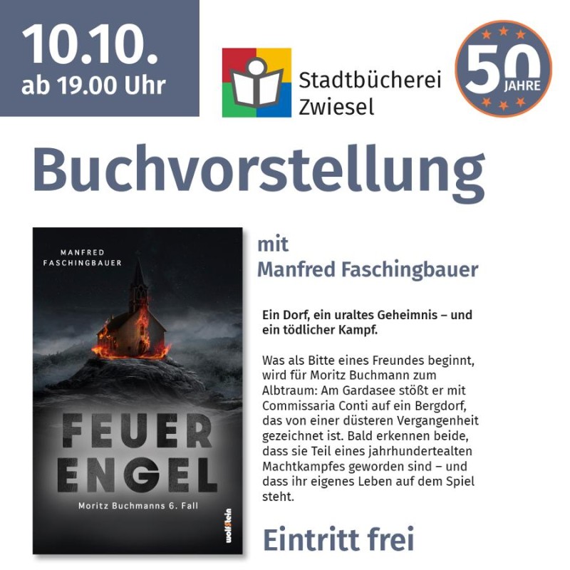 Buchvorstellung „Feuerengel“ – Moritz Buchmanns 6. Fall, mit Manfred Faschingsbauer in der Stadtbücherei Zwiesel, Rathaus Rückseite. Eintritt frei.