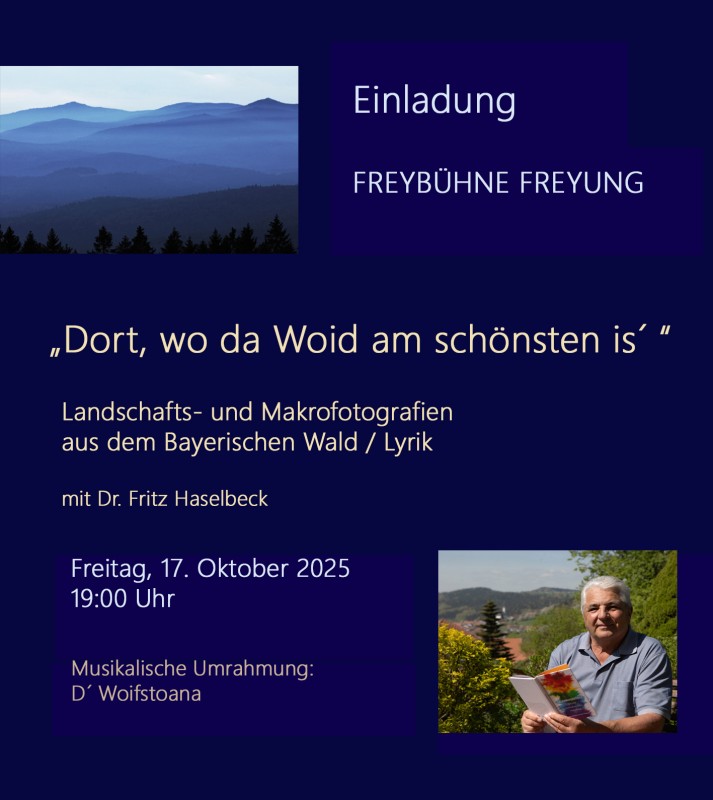 Eine wunderbare Kulturbegegnung mit Naturfotografien aus dem Unteren Bayerischen Wald bietet die Freybühne Freyung allen Naturliebhabern und Heimatfreunden. Der renommierte Fotograf und Buchautor Dr. Fritz Haselbeck aus Grainet präsentiert unter dem Motto Dort, wo da Woid am schönsten is faszinierende Eindrücke und Stimmungsmotive in eindrucksvollen Bildern.