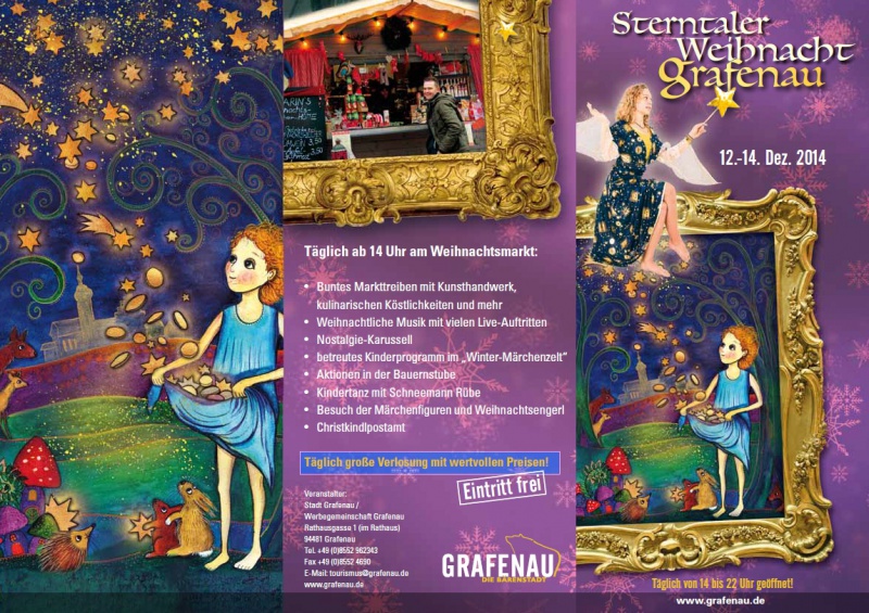 Grafenauer Weihnachtsmarkt unter dem Motto "Sterntaler Weihnacht- Märchenhafter Wintertraum rund um den Grafenauer Stadtplatz" mit Buden und buntem Rahmenprogramm: ab 14 Uhr Buntes Markttreiben, Kinderschminken im "Wintermärchen-Zelt", Nostalgie-Karussell auf der Mittelinsel.