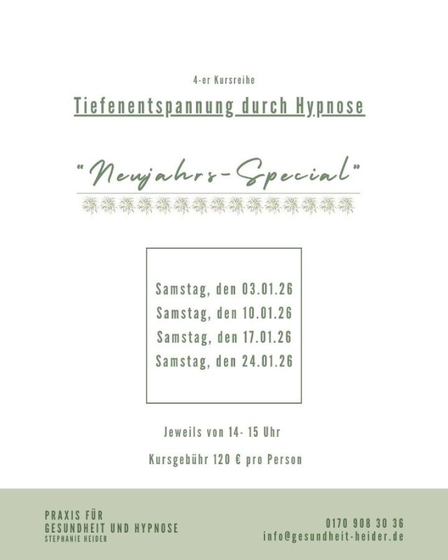 "Neuhjahrs special" in der Praxis für Gesundheit und Hypnose Stephanie Heider. Hypnose kann sanft und nachhaltig bei vielen individuelle Themen unterstützen. Hypnose nutzt bereits vorhandene körpereigene physiologische Prozesse, die helfen „Altes sein zu lassen und Neues zu lernen“. In Ruhe und Entspannung sind wir besonders offen für unterstützende Worte.Mit dem “Neujahrs Special” unterstütze ich Dich Tiefenentspannung zu finden und unnötigen Ballast loszulassen, aber auch neue Themen fokussiert anzugehen. Themen wie Dein persönliches Glück und Zufriedenheit zu finden, oder auch Deine individuellen Ziele und Neujahrsvorsätze 2026 zu erreichen.Ganz gleich ob als "Hiesiger" oder als Urlaubsgast- für Dich kann es ein ganz persönliches und nachhaltiges Erlebnis werden.Kursgebühr: 120,--€ pro Person; Anmeldung unter 0170-9083036