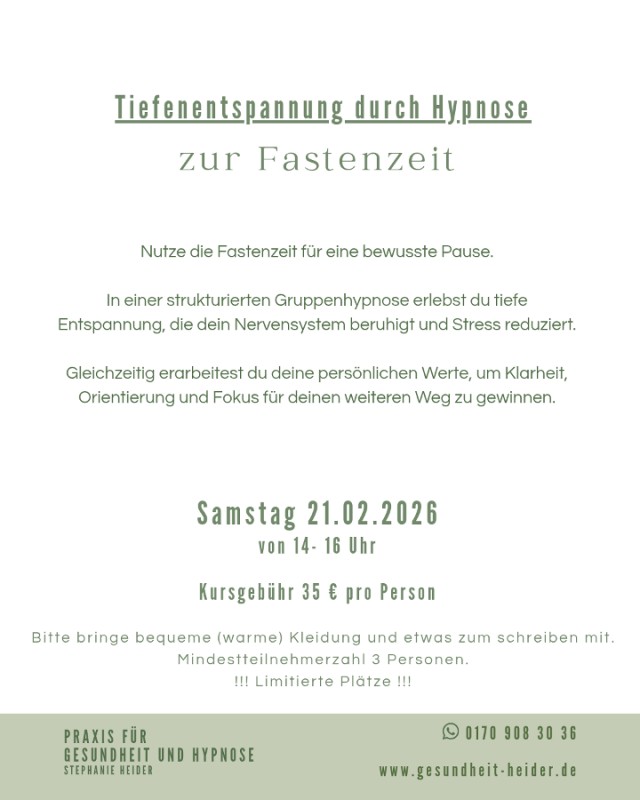 in der Praxis für Gesundheit und Hypnose -Stephanie Heider. Nutze die Fastenzeit für beine bewusste Pause. In einer strukturierten Gruppenhypnose erlebst du tiefe Entspannung, die dein Nervensystem beruhigt und Stress reduziert. Gleichzeitig erarbeitest du deine persönlichen Werte, um Klarheit, Orientierung und Fokus für deinen weiteren Weg zu gewinnen. Kursgebühr 35,--€ pro Person. Anmeldung unter 0170-9083036 unbedingt erforderlich! Bitte bringe bequeme (warme) Kleidung und etwas zum schreiben mit.