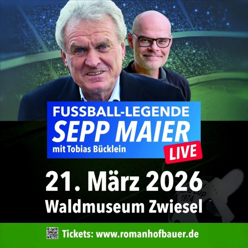 im Waldmuseum Zwiesel. Erleben Sie die Torwart-Legende hautnah! Ein Abend voller Geschichten, Humor und unvergesslicher Fußballmomente. In der Porträtshow mit dem Konstanzer Musiker und Moderator Tobias Bücklein wird neben seiner Sicht auf den Profifußball und persönlichen Lebenserfahrungen sicher auch Maiers musikalische Tätigkeit zur Sprache kommen. Tickets in der Touristinfo oder unter www.romanhofbauer.de