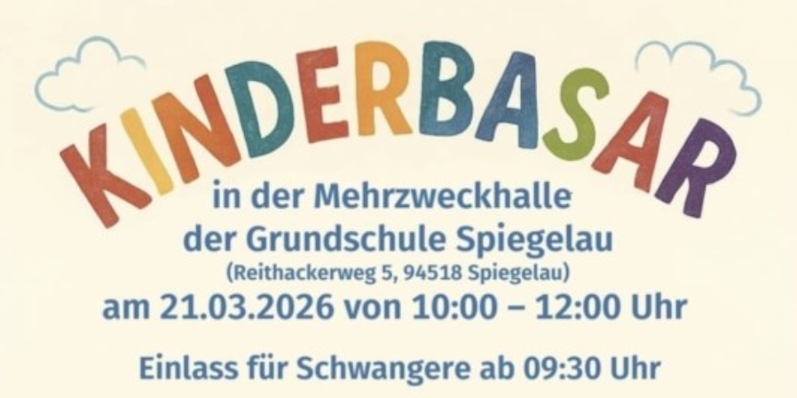 Kinderbasar in Spiegelau am Samstag, 21.03.2026 von 10:00 bis 12:00 Uhr in der Mehrzweckhalle der Grundschule Spiegelau.