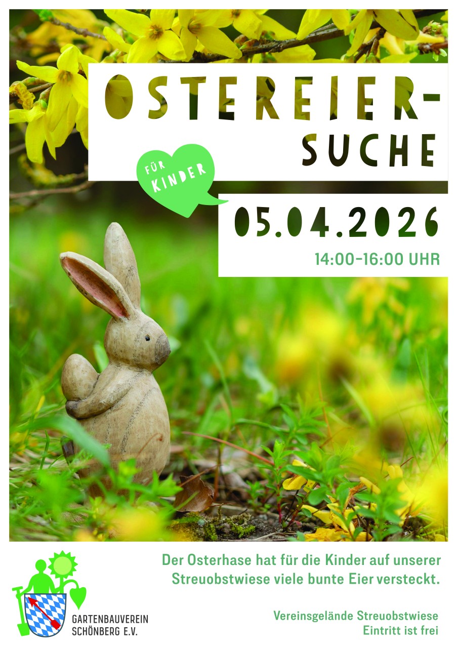 Der Gartenbauverein Schönberg lädt alle Kinder herzlich zur fröhlichen Ostereiersuche auf unserer Streuobstwiese ein am 05.04.2026 vonn 14:00 – 16:00 Uhr auf der Streuobstwiese.