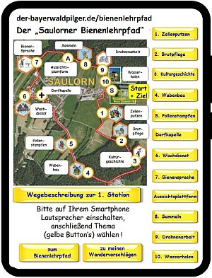 1. über Smartphone als „multimedialer Wanderführer“, bei dem die einzelnen der 10 Stationen und die einzelnen Wege zu und zwischen den Stationen auditiv und visionell erklärt werden. (www.der-bayerwaldpilger.de/bienenlehrpfad