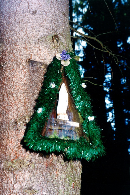 Diese Bergtafel wurde ungefähr um die Jahrhundertwende (1900) an einem Waldweg am Haselberg engebracht. Ein Vorfahre soll an der Vorstellung gelitten haben, hier am Haselberg würde es "weihrazn". Zu seiner Beruhigung hängte man dieses Muttergottesbild an einen Baum am Weg.