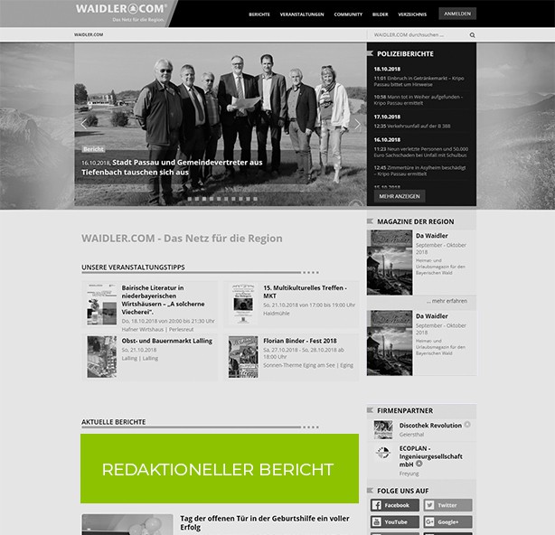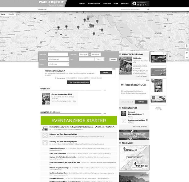 Als regionales Portal bietet WAIDLER.COM einen sehr umfangreichen Veranstaltungskalender und Werbemöglichkeiten für den Raum Freyung-Grafenau, Passau, Deggendorf, Regen, Waldkirchen. Straubing und weiteren Umkreis.
